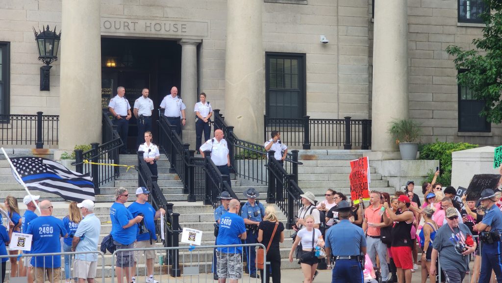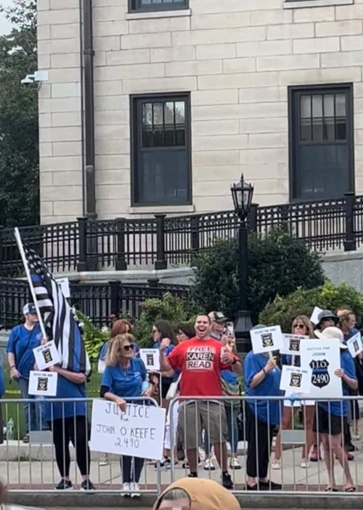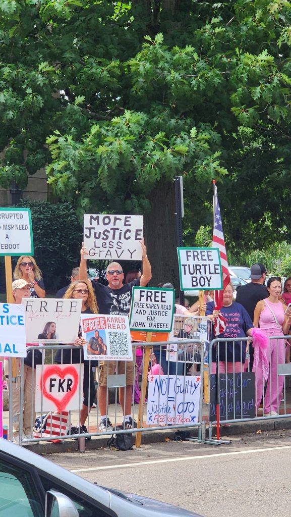 I drove over to the denim courthouse, Karen Reed is having a hearing today to try to vacate to chargers that the jury voted unanimously not guilty on during her mistrial. When I arrive at the courthouse all the protesters are in full force. It’s interesting because now there are anti-Free Karen Read protesters who dress in all blue and wave thin blue line flags and like to say that Karen Read is guilty.
