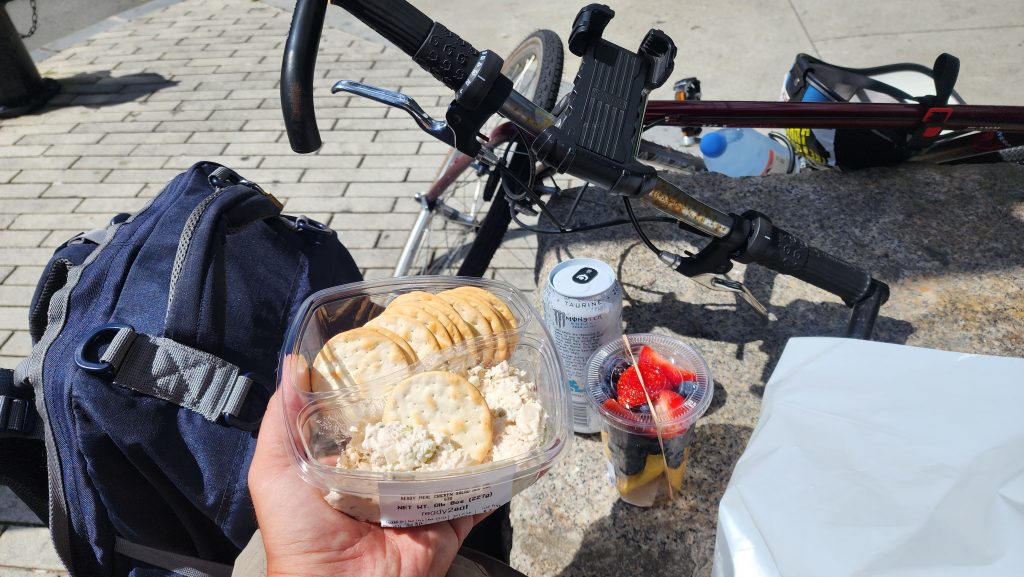 I collected my gear and I rode my bike over to the Lowell train station to take the 10:20 a.m. train to North Station. When I arrived in Boston I stopped at Star Market and got some Chicken Salad with crackers, Monster, and Fruit cup.