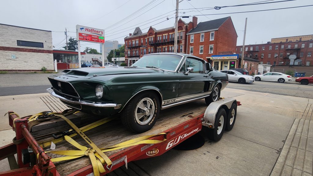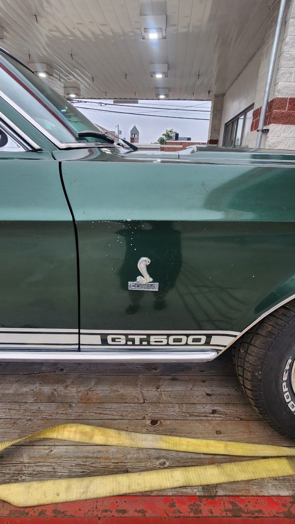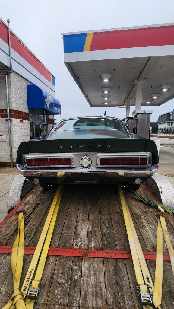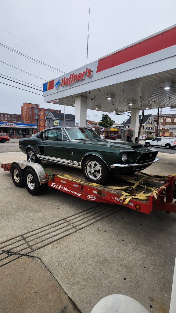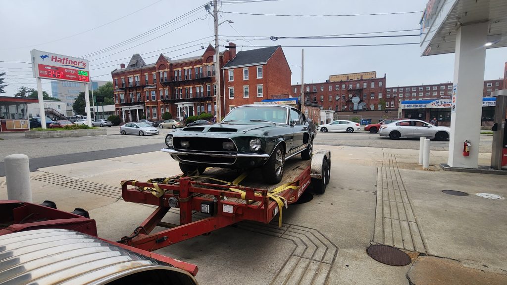 I got my stuff together to go play handball with the fellas. Outside my girlfriend’s apartment at the gas station I saw a truck with a trailer, that had an old 1968 Shelby Cobra Mustang on it. I had to take some pictures.